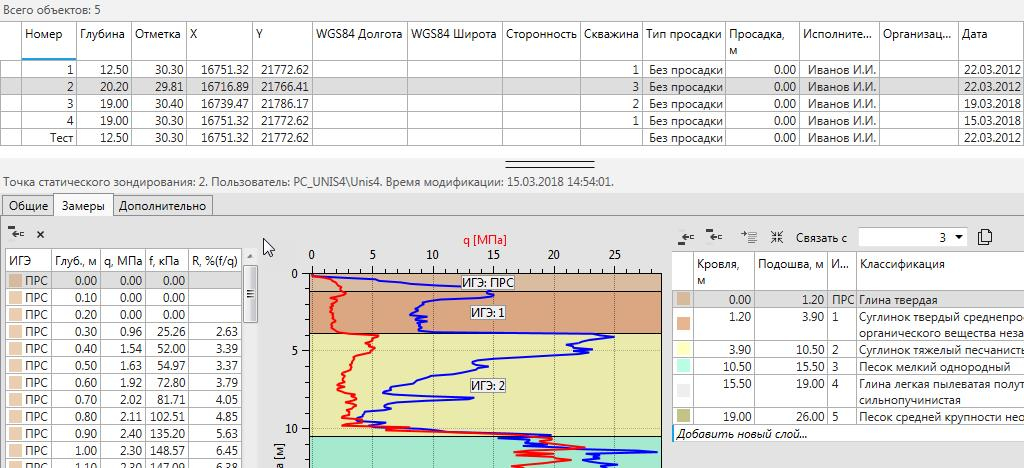 Все объекты, хранимые в системе, могут быть отображены на чертеже с учетом собственной специфики (скважины, точки статического и динамического зондирования, крыльчатки, штампы, термометрия);