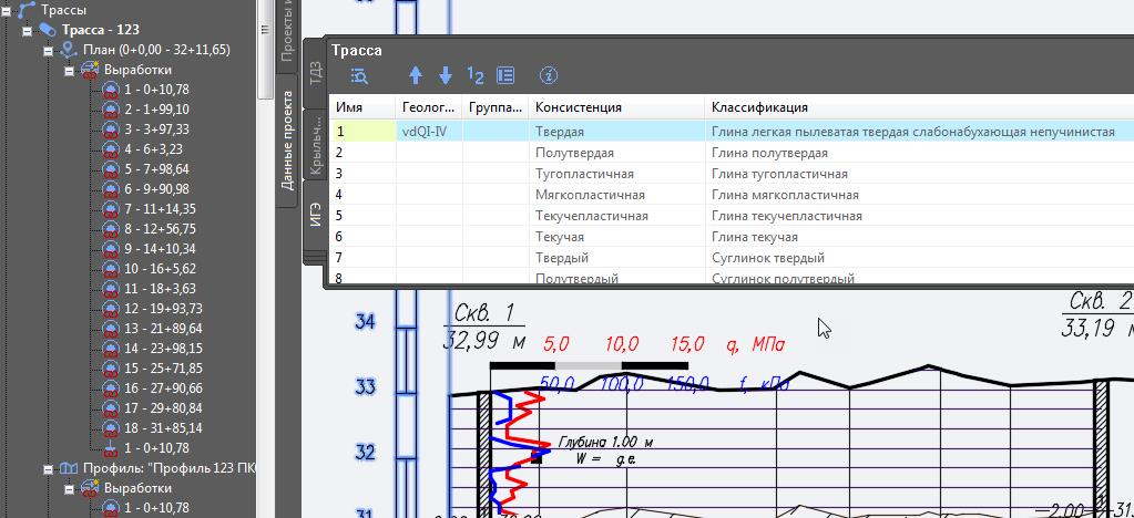 Связь выработок с трассами для нанесения на инженерно-геологический разрез, реализована по ссылочному принципу, что позволяет сохранять актуальность данных в связке инженерно-геологический разрез – каталог выработок;